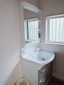 洗面化粧台を新しく交換し、収納力もアップ。清潔感のある洗面スペースを実現しました。床材には水に強く掃除のしやすい素材を使用し、明るさと快適性を向上。全体的にスッキリと使いやすい空間となりました。